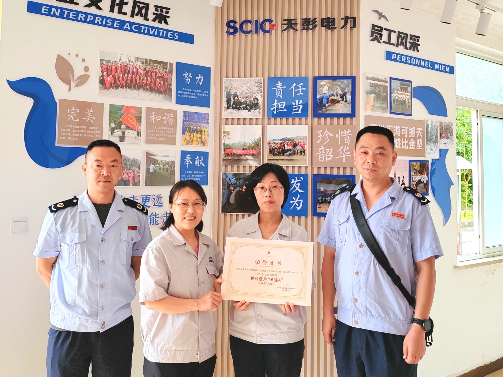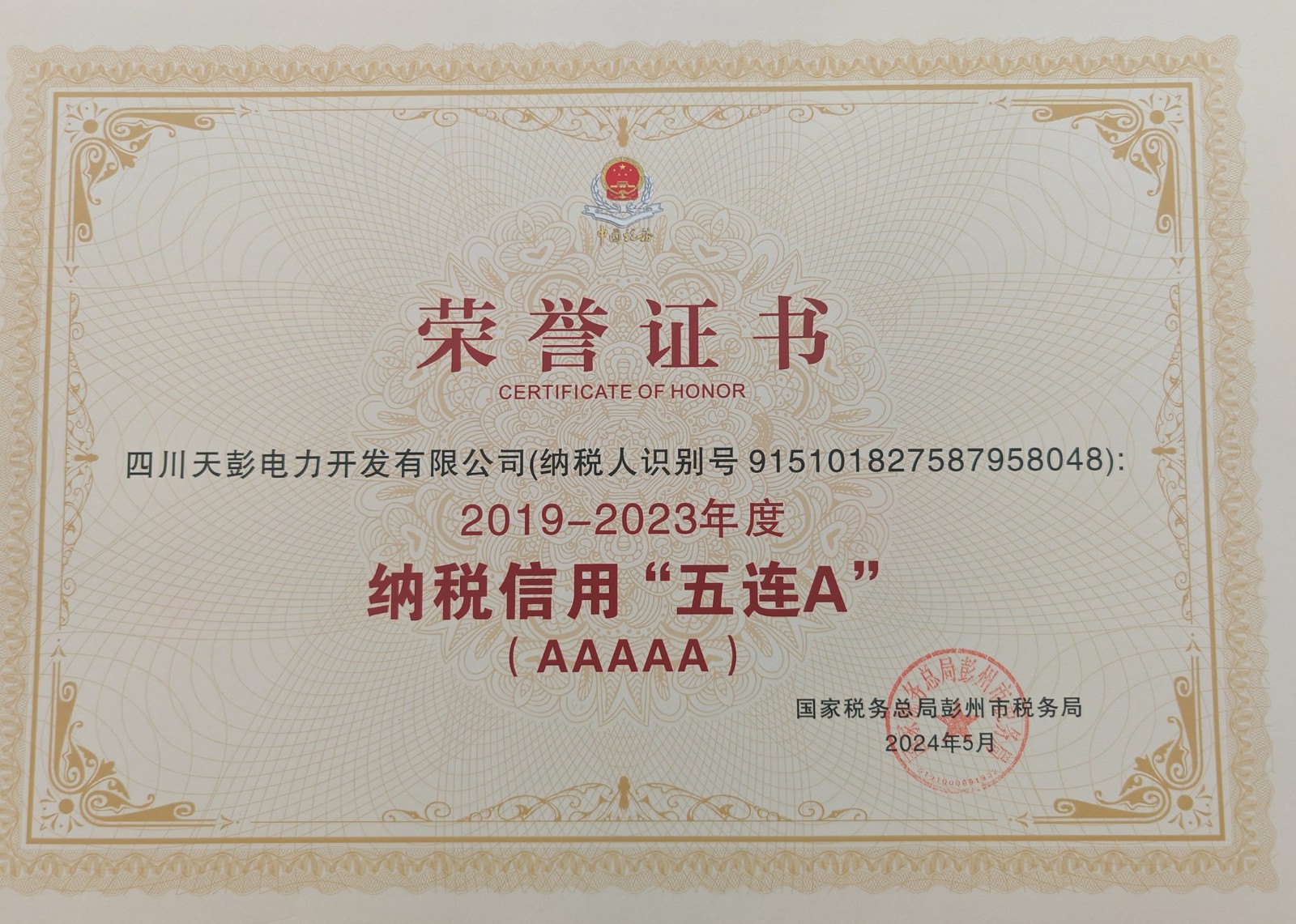 6月11日,710公海赌赌船官网欢迎您能源所属天彭电力公司喜获殊荣:国家税务总局彭州市税务局向我公司授予了“彭州市‘2019-2023年度纳税信用五连A’”荣誉证书,这是税务机关对我公司诚信纳税、守法经营的肯定和表彰。