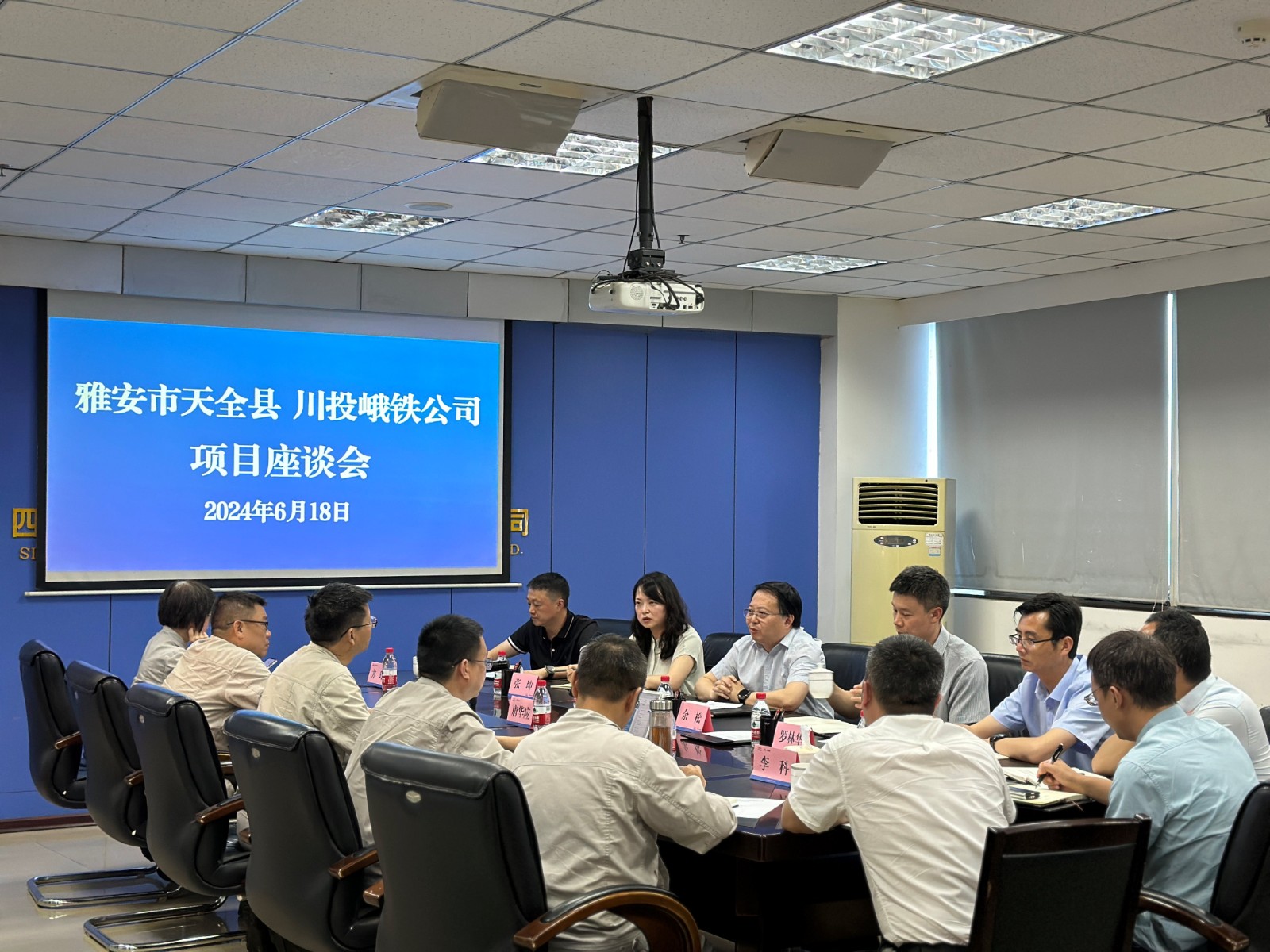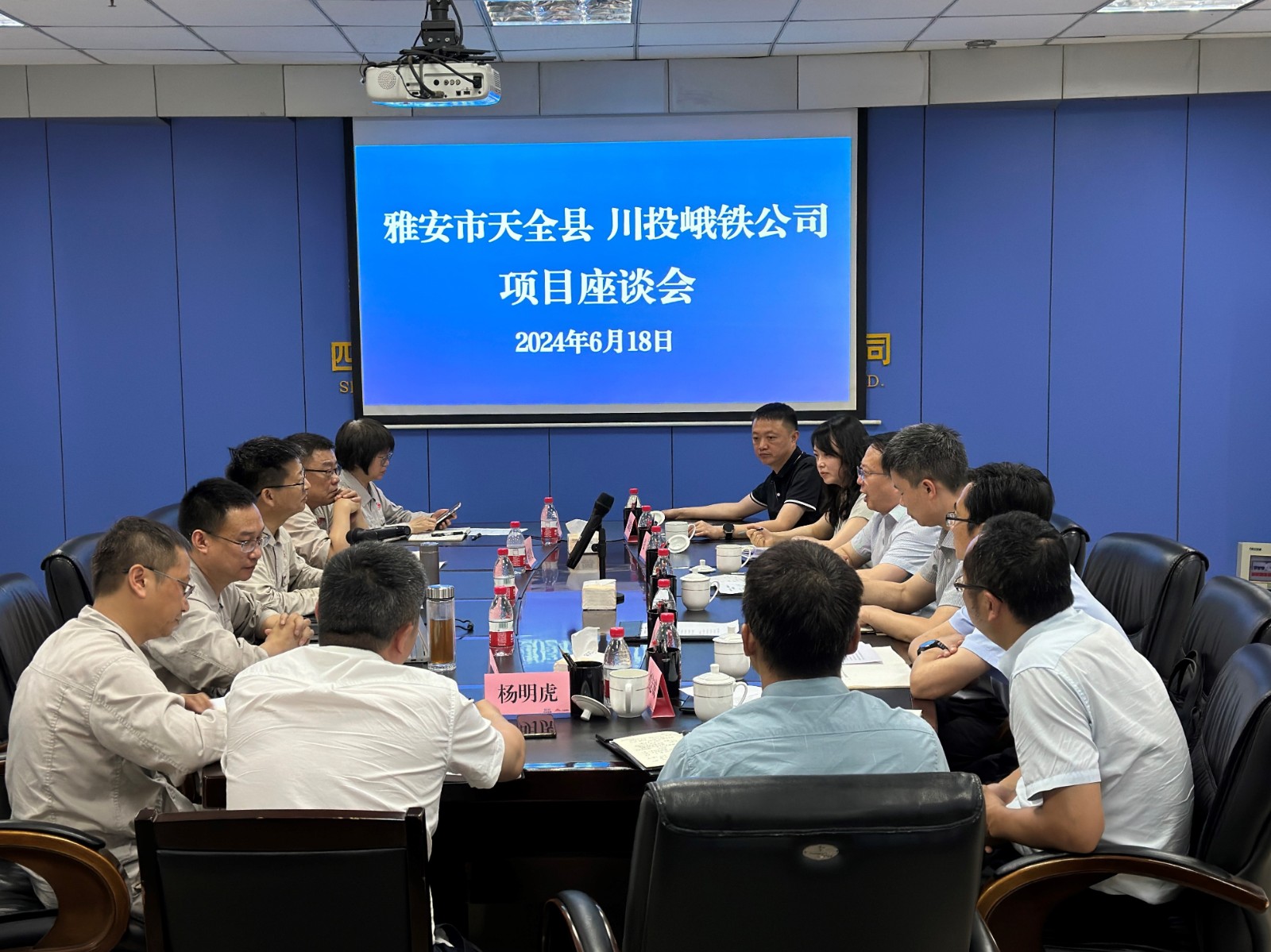 6月18日,天全县县委书记余力,县委常委、县人民政府常务副县长余松,雅安市发改委环资科科长张坤等一行到访710公海赌赌船官网欢迎您峨铁公司,710公海赌赌船官网欢迎您峨铁公司党委书记、董事长唐华应,党委副书记、总经理陈新龙与代表团一行召开了项目座谈会。
