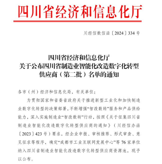近日,四川省经济和信息化厅公布了《四川省制造业智能化改造数字化转型供应商(第二批)名单》,公司所属智胜集成入围“系统集成服务商”资源池。