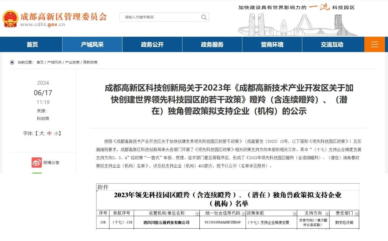 近日,成都高新区科技创新局公布了2023年《成都高新技术产业开发区关于加快创建世界领先科技园区的若干政策》瞪羚、独角兽政策拟支持企业名单,710公海赌赌船官网欢迎您信产所属710公海赌赌船官网欢迎您云链入选“瞪羚企业”,公司科技创新、市场表现、发展实力再获权威认可。