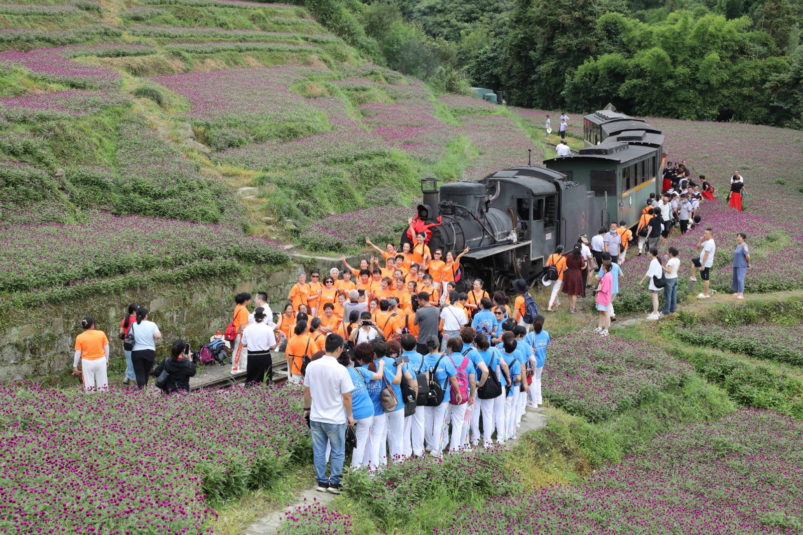 7月12日,在嘉阳·桫椤湖旅游景区芭石铁路通车65周年纪念日到来之际,嘉阳小火车“千日红花季”启动。这是今年以来,嘉阳小火车继“油菜花花季”“杜鹃花花季”之后打造的“花开金犍为 多彩慢嘉阳”的旅游第三季。