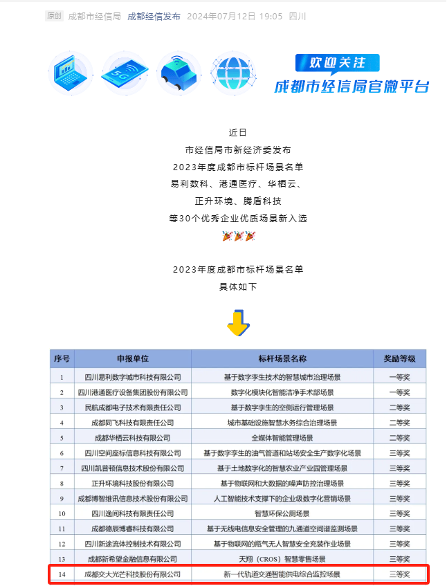 近日,成都市经信局市新经济委发布了2023年度成都市标杆场景名单,交大光芒新一代轨道交通智能供电综合监控场景荣获三等奖。