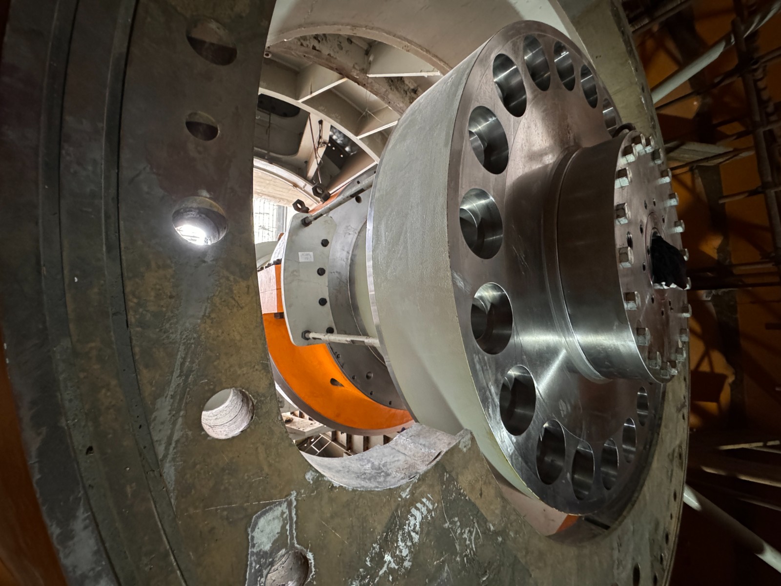 银江水电站灯泡贯流式机组主轴为整锻永久把合结构,总长9.6米,端部最大直径2.83米,总重量142.66吨,顺水流方向安装,是连接发电机转子和水轮机转轮,传递各种工况条件下扭矩的核心转动部件。主轴安装精度高,中心位置需控制在0.5毫米以内,端部跳动需控制在0.03毫米以内。