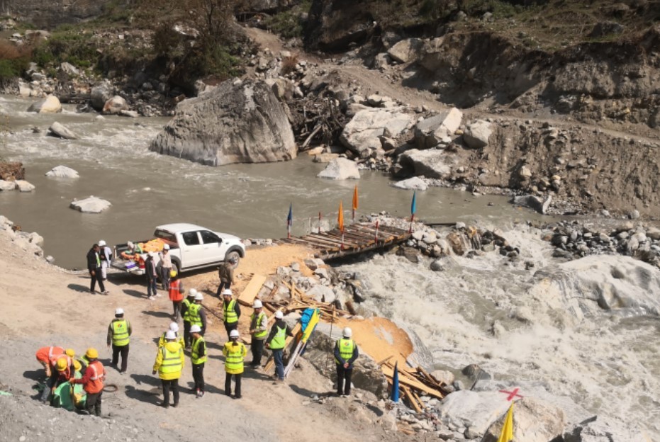 自汛期以来,马楠马相迪水电站项目对外道路已经历了1次道路塌方,十余次边坡落石。在全方位掌握气象变化的基础上,项目参建各方组织专业人员对施工现场进行了全面的安全隐患排查,重点检查了施工道路、临时设施等关键部位的抗洪能力并组织人力物力进行加固处理,安排挖掘机进行疏通河道、加固桥头道路和设施。