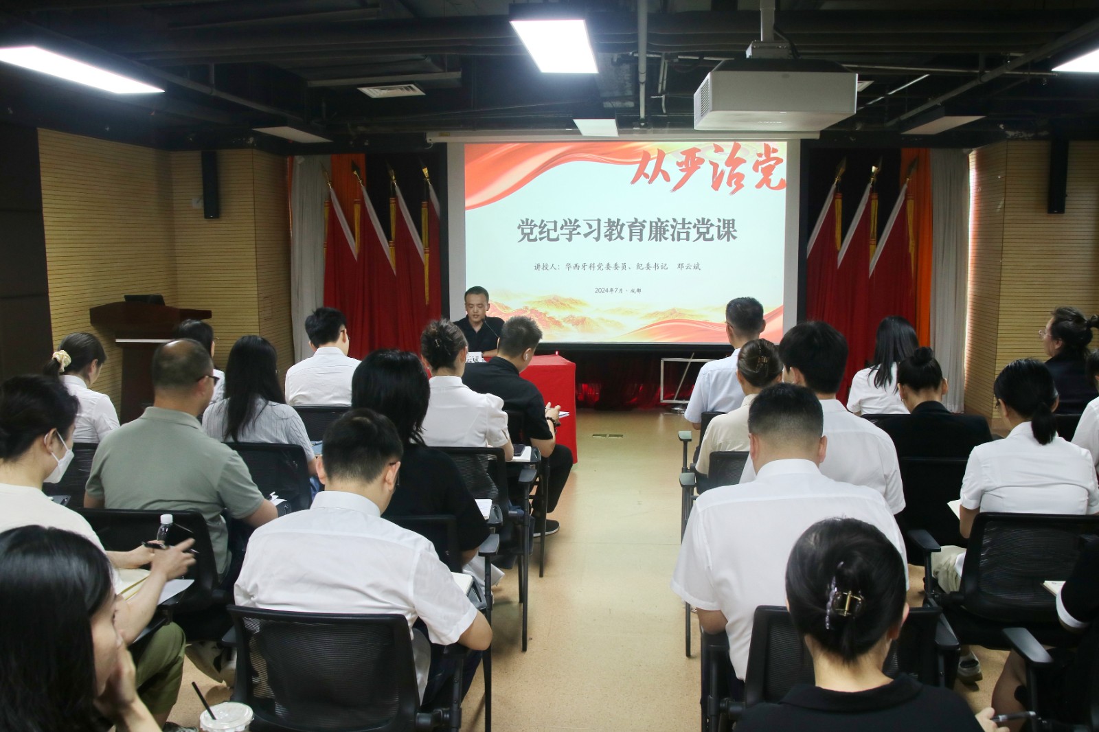 按照党纪学习教育工作安排,7月30日,华西牙科党委委员、纪委书记邓云斌在四川口腔医院13楼会议室开展了第四期“五心讲堂”暨党纪学习教育专题廉洁党课。