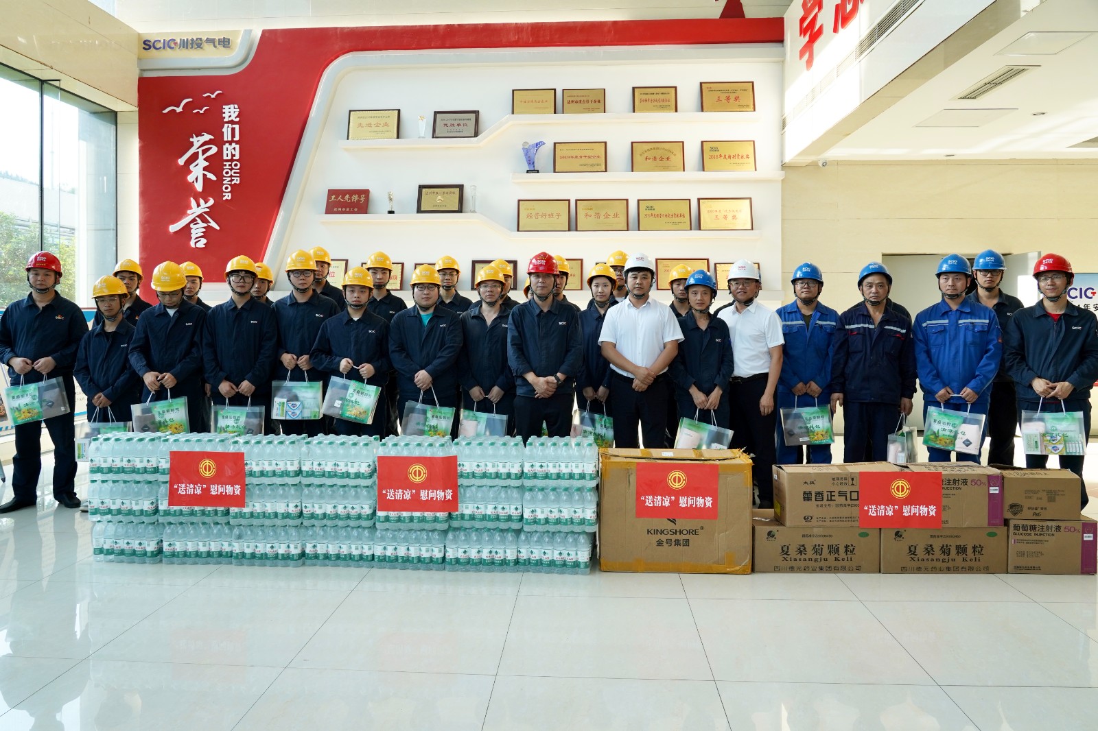 刘海波一行在听取机组发电、防汛减灾等工作汇报后,将风油精、荷香正气液、葡萄糖、矿泉水等100余份充满关爱的清凉防暑物资送到一线检修、运行职工的手中,并与一线职工进行亲切交谈,叮嘱大家工作中注意安全环保,完善防暑降温措施,确保迎峰度夏期间电网安全稳定运行。