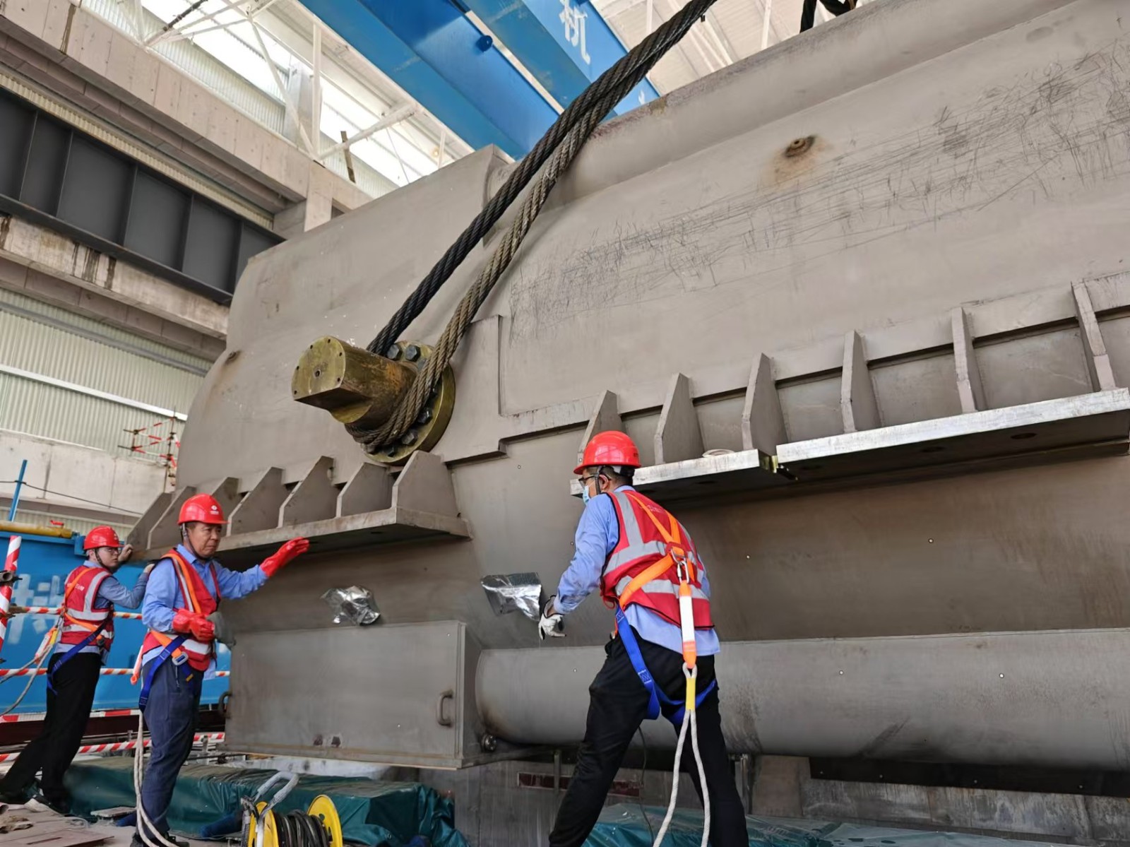 发电机定子作为主厂房内最重的单体设备,长10.3米、宽4.868米、高4.7米,重达367吨。为确保发电机定子吊装平稳、就位精准,项目建设团队组织制定详细的吊装施工方案,提前做好设备和工器具保障,从场外运输至场内卸车全过程反复推演,逐项落实。同时,在吊装期间实施全程监督,严控安全质量,确保整个吊装过程安全、有序、可控。