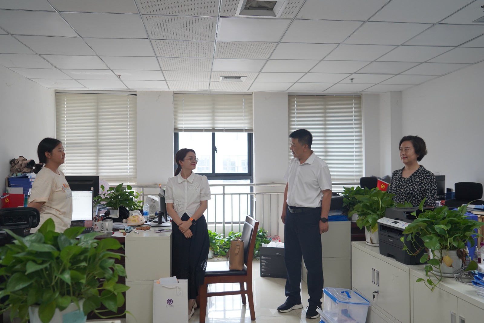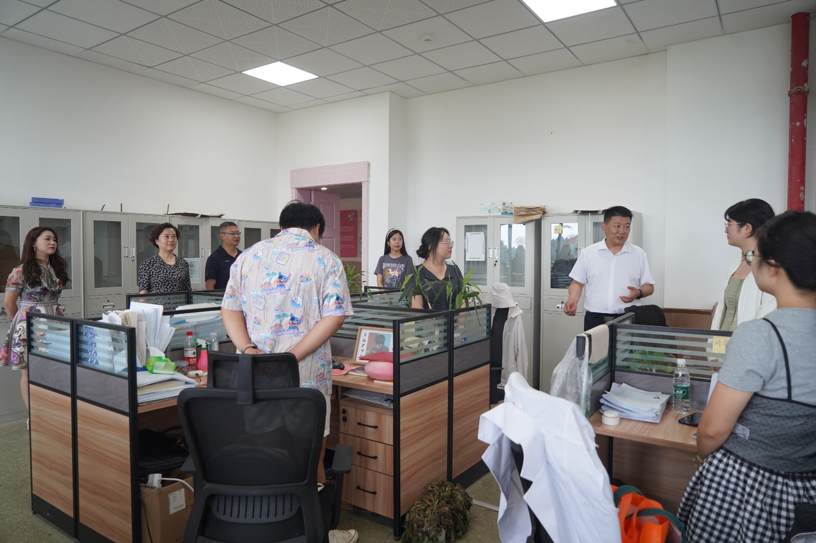 走访过程中,学院领导与教职员工亲切交流,详细询问各部门负责人新学期开学准备工作情况,重点就新教师入职、学生报到注册准备、人才培养模式、教学科研任务安排及进展、校园文化建设、后勤服务保障等工作情况进行了解,共同探讨特色专业发展路径。学院领导对大家饱满的精神状态给予充分肯定,对暑假一直坚守在各个管理、服务、教学科研等工作岗位和校园维修改造项目的教职工表示衷心感谢。