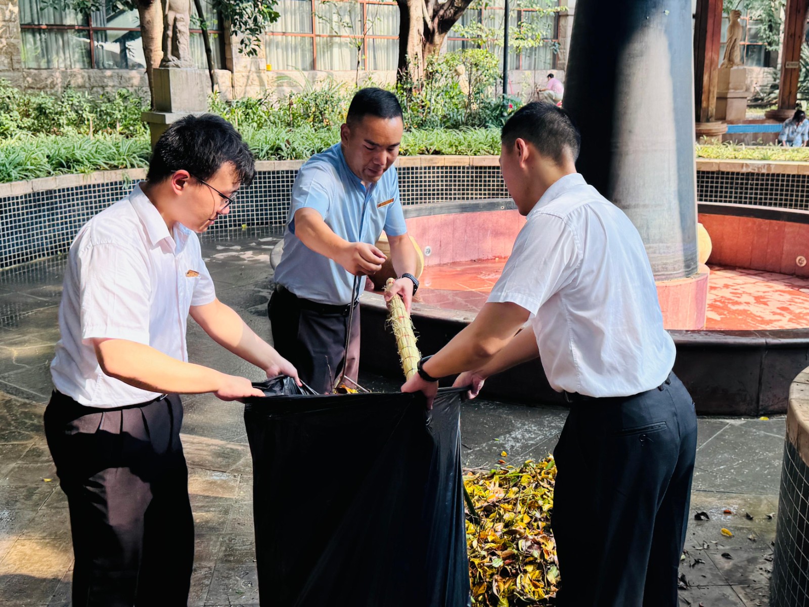 面对狂风暴雨后的杂乱环境,为确保酒店正常经营和宾客的舒适体验,公司党支部副书记、酒店负责人范英迅速组织酒店营销部门及办公室全体人员投入到一线经营区域雨后恢复工作中,清理倒树、疏通道路、消除隐患,及时将杂乱无章的经营区域在当日正式营业前恢复如初。