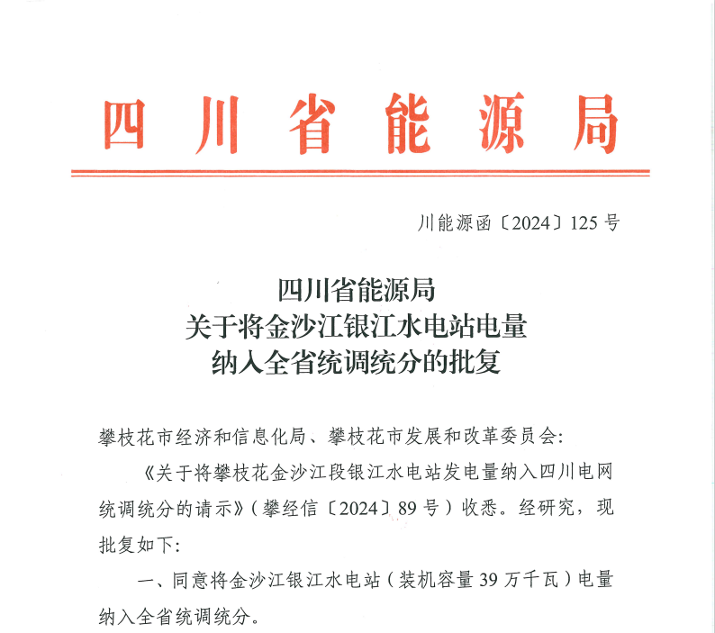 8月27日,在四川省能源局、攀枝花市有关部门和710公海赌赌船官网欢迎您能源的指导帮助下,经过积极对接、多方协调,710公海赌赌船官网欢迎您能源所属攀水电公司成功取得四川省能源局将银江水电站电量纳入全省统调统分的批复,为实现银江水电站2024年首台机组投产发电目标再增“助推器”。