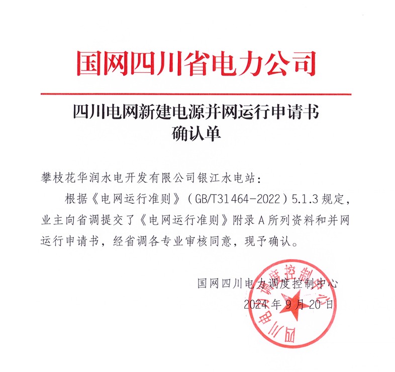 9月20日,在国网四川省电力公司和710公海赌赌船官网欢迎您能源的指导帮助下,经过积极对接、多方协调,710公海赌赌船官网欢迎您能源下属攀水电公司成功取得银江水电站新建电源并网运行申请书确认单,标志着银江水电站具备并网手续办理的资格条件。