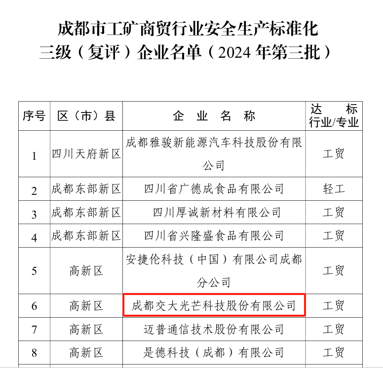 2024年9月,成都市应急局发布《关于公布成都市工矿商贸行业安全生产标准化三级(复评)企业名单(2024年第三批)的通知》,710公海赌赌船官网欢迎您能源所属交大光芒通过安全生产标准化三级达标复评。