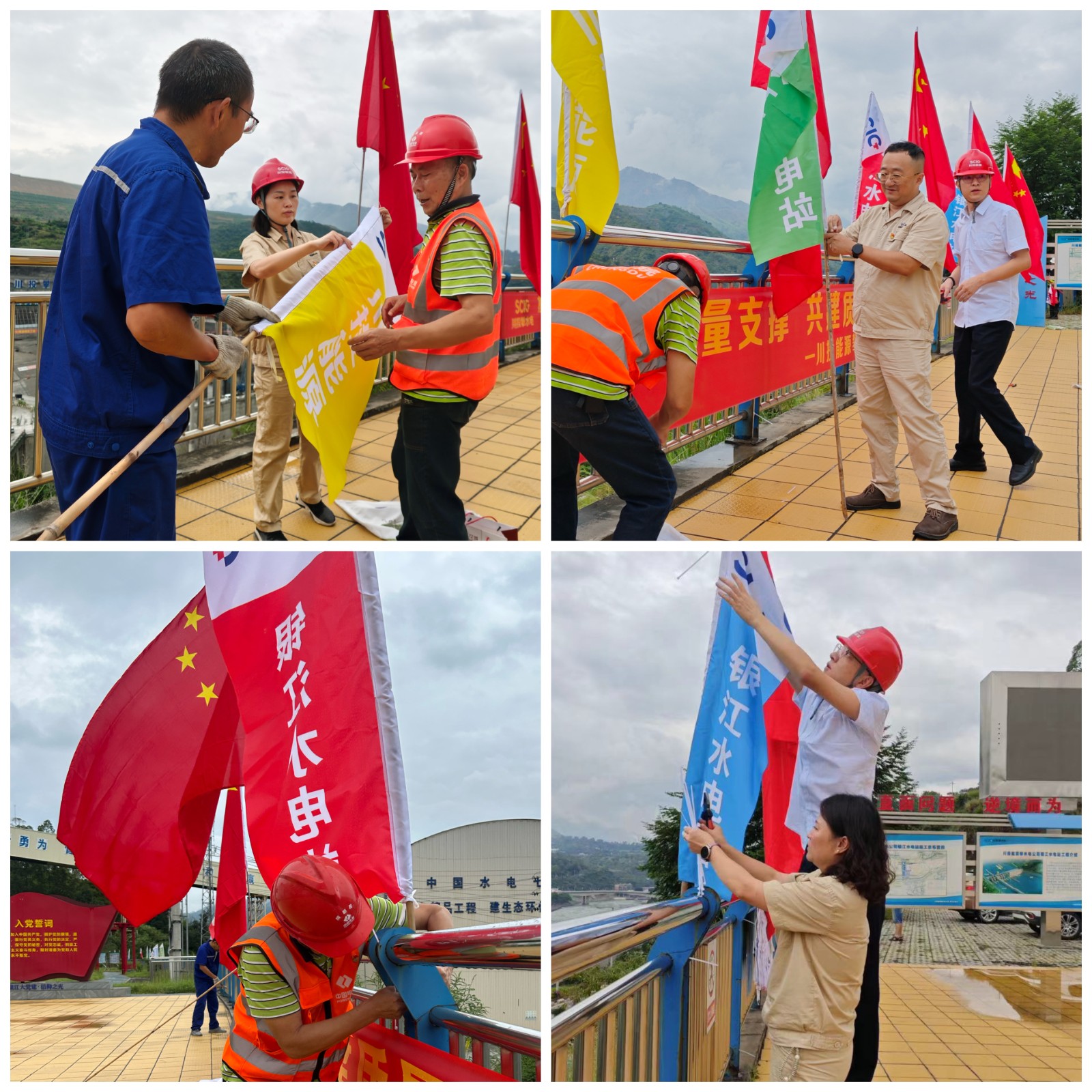 在大家的共同努力下, 一面面崭新鲜艳的五星红旗,一幅幅绚丽的彩旗挂在党建宣传阵地和施工区域,红旗彩旗与绿水青山交相辉映,随着江风袭来迎风招展,构成了金沙江畔的美丽画卷。每名党员都用劳动之美迎接国庆节的到来,用务实的工作作风确保实现银江水电站年底发电目标,用实际行动向祖国母亲75岁华诞献礼。