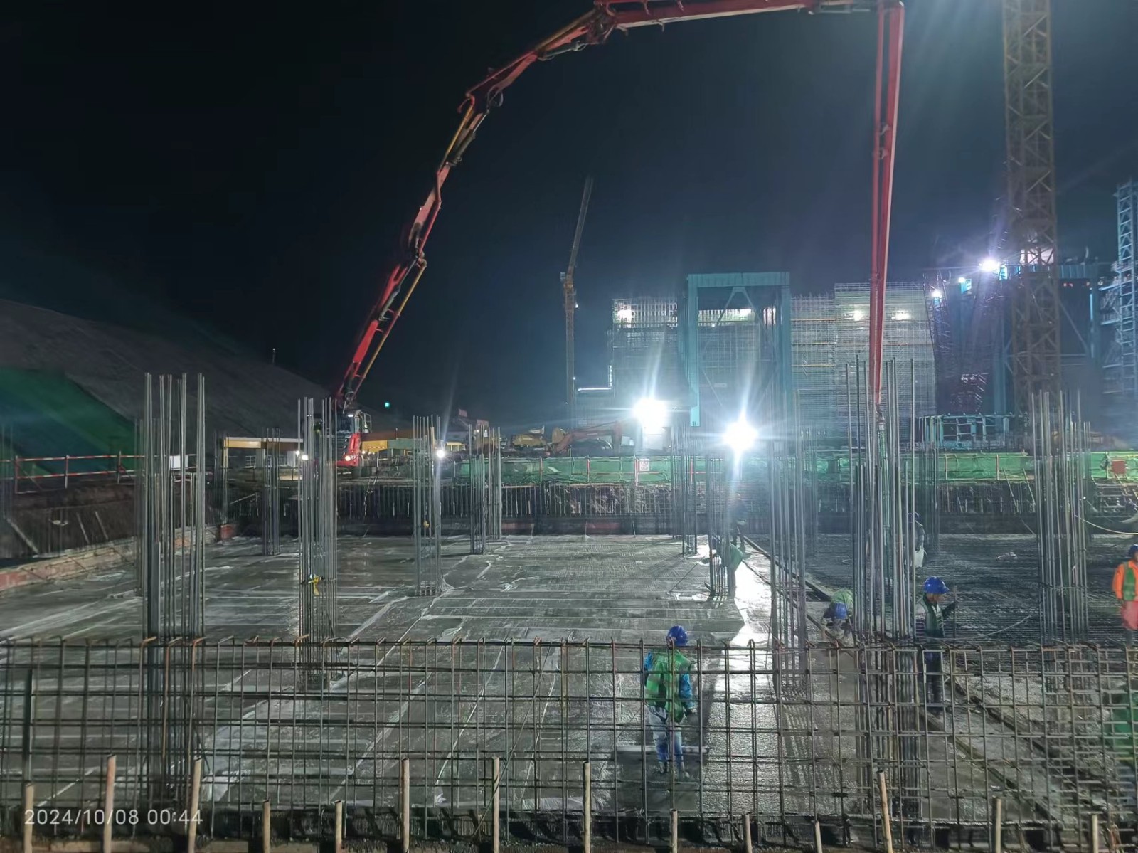 施工现场大型机械设备如泵车、吊车正全速运转,汽机基座的钢筋绑扎、混凝土浇筑等工作全面铺开,近400位工人每日坚守在生产建设第一线,以饱满的热情和坚定的决心,全力以赴推动主厂房25.7米至39.2米柱梁施工,向着10月中旬主厂房结构封顶以及#3汽机岛浇筑的目标发起最后的冲刺。