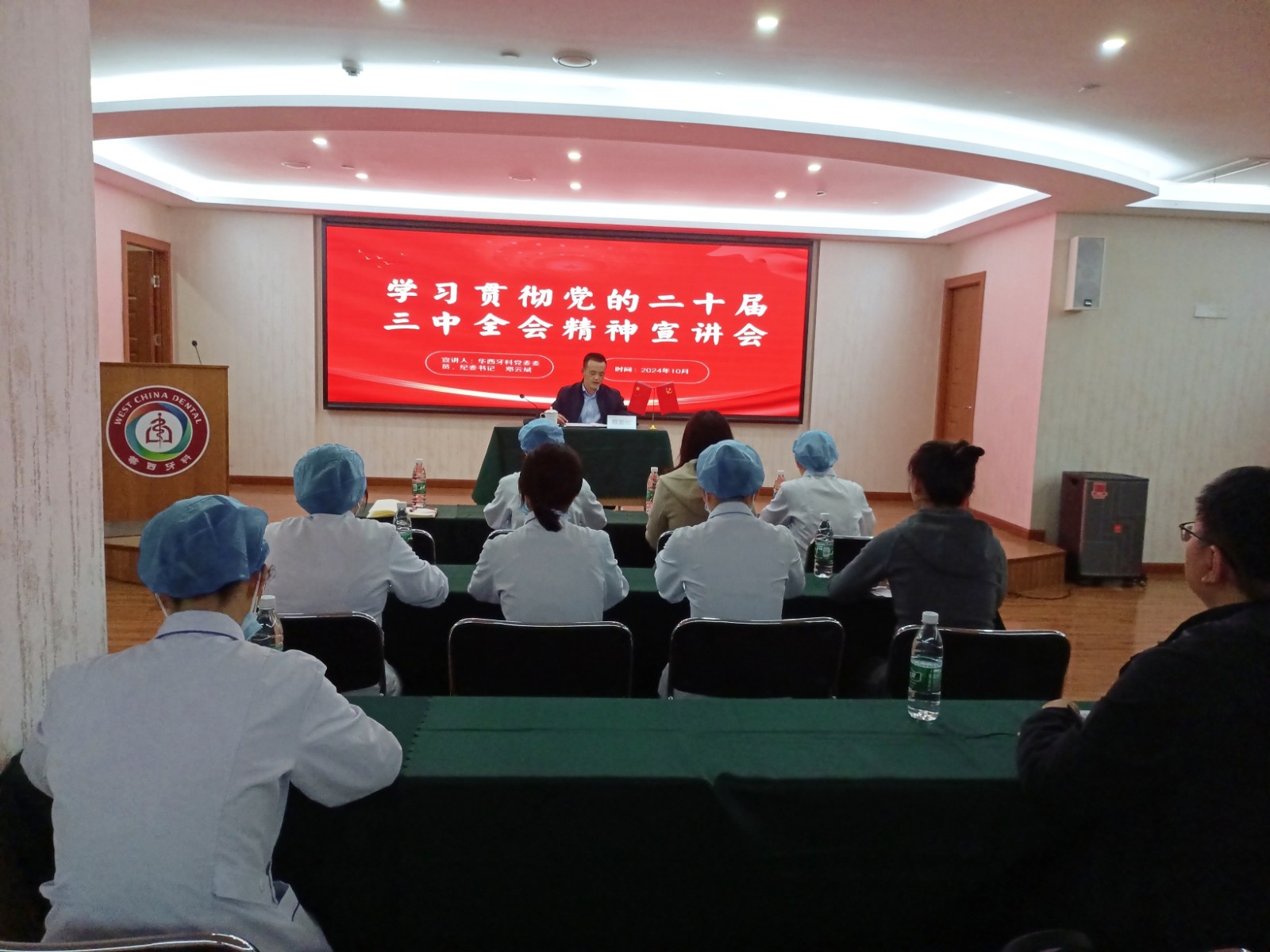 10月11日,华西牙科党委委员、纪委书记邓云斌赴重庆华西牙科医院开展学习贯彻党的二十届三中全会暨省委十二届六次全会精神专题宣讲,重庆华西牙科医院全体党员、团员参加。