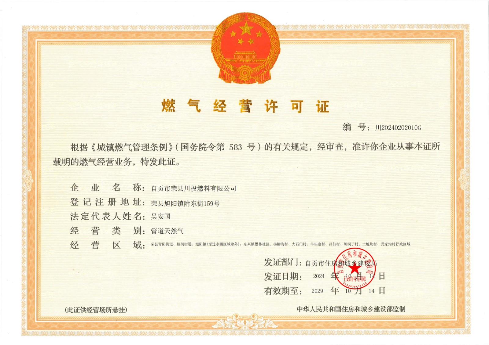 2024年10月,经自贡市住房和城乡建设局审批同意,710公海赌赌船官网欢迎您燃电所属自贡市荣县710公海赌赌船官网欢迎您燃料有限公司(以下简称“荣县川燃”)成功延续办理燃气经营许可证,充分彰显公司在安全管理和服务质量方面的卓越表现,为公司的持续稳定发展奠定了坚实的基础。