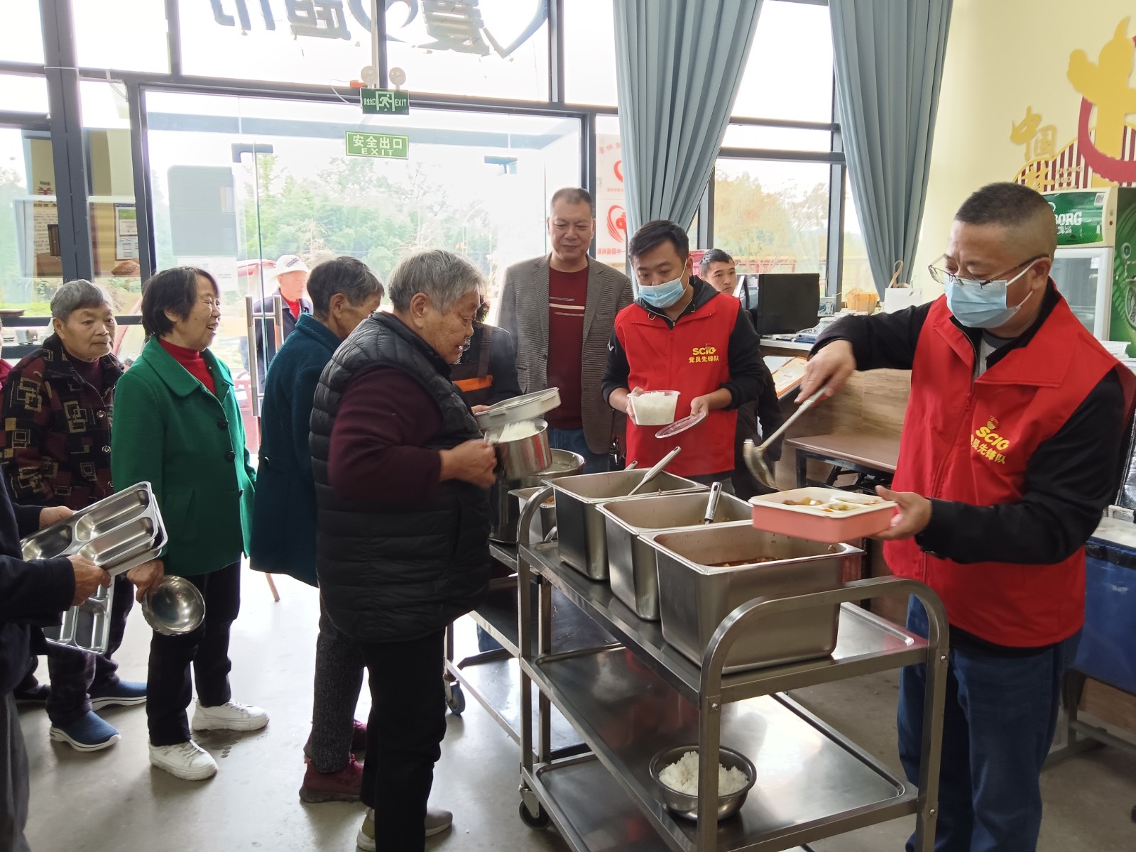 井然有序的活动现场,身着醒目红色马甲的党员们迅速分工、密切合作,有的拿起扫帚、拖把和抹布开展卫生清洁,从地面到墙面、从桌椅到餐具的每一个角落,为老人们营造整洁舒适的就餐环境;有的为行动不便的老年人及时送餐上门,让他们能心情愉悦地享用美食;有的则陪伴在老人身边与他们亲切交谈,关爱他们的健康与需求,倾听他们的心声与故事。“爸妈食堂”内忙碌穿梭的党员身影,构成了一幅幅温馨动人的画面。