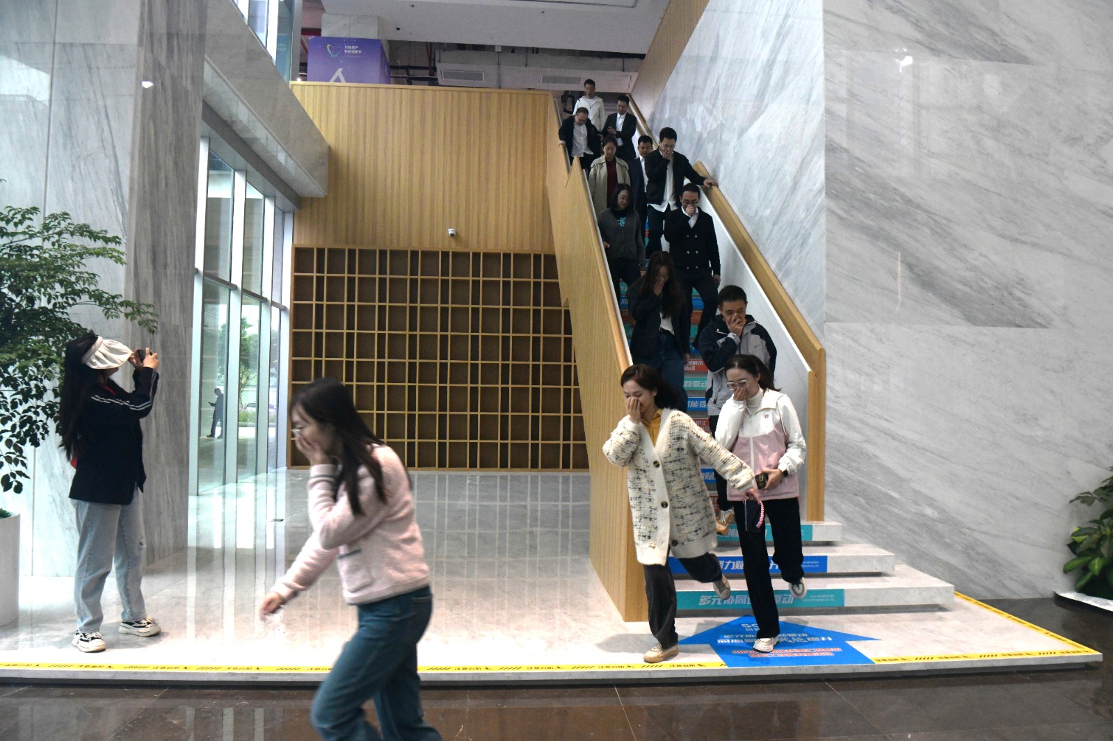 “着火啦,快有序疏散!”在模拟办公楼内突发火灾事故的应急逃生演练环节中,随着指挥员的一声令下,消防安全演练正式开始。工作人员按照预先制定的高处应急逃生方案,迅速组织现场演练人员有序逃生。大家用毛巾捂住口鼻、弯腰低姿迅速向安全出口方向疏散,整个疏散过程行动迅速,不慌不乱,安全有序。