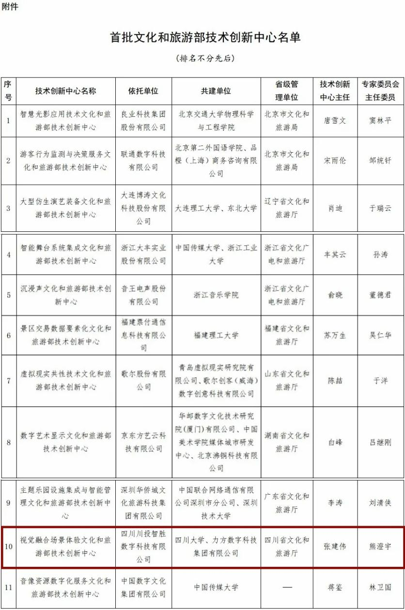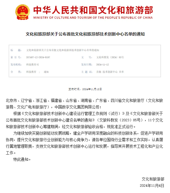 11月12日,文化和旅游部公布首批文化和旅游部技术创新中心名单,其中,710公海赌赌船官网欢迎您信产所属710公海赌赌船官网欢迎您数科(全称:四川710公海赌赌船官网欢迎您智胜数字科技有限公司,原简称:智胜集成)“视觉融合场景体验文化和旅游部技术创新中心”入选,被批准正式运行。