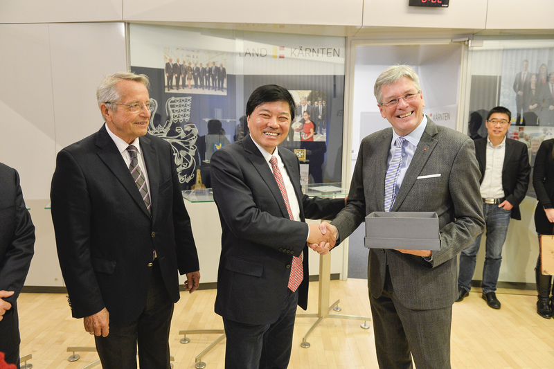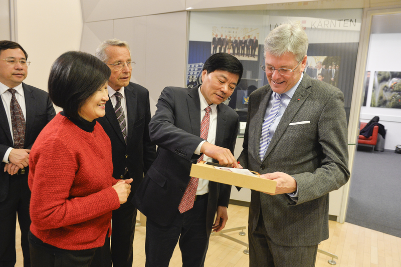 2018 sei ein sehr erfolgreiches Jahr für K?rnten gewesen, erkl?rte der Landeshauptmann. So sei es gelungen, das gr??te Wirtschaftswachstum von allen ?sterreichischen Bundesl?ndern zu erzielen. "K?rnten ist mit seiner einzigartigen Natur als Tourismusland bekannt. Ich m?chte aber auch betonen, dass 55 Prozent unserer Wertsch?pfung aus einer sauberen und zukunftsorientierten Industrie kommen. K?rnten setzt sehr stark auf Forschung und Entwicklung und verfügt gleichzeitig über ein sehr stark ausgepr?gtes Klein- und Mittelunternehmertum", so Kaiser. K?rnten sei mit seiner Lage am Schnittpunkt dreier Kulturen auch daran interessiert, Interkulturalit?t und Internationalit?t zu leben. Mit Investitionen in das Fürnitzer Logistikzentrum verfolge man das Ziel, zu einer Drehscheibe für Produkte im Alpe-Adria-Raum zu werden. Kaiser sagte der chinesischen Delegation jedwede Unterstützung seitens der Landesregierung zu, um Kooperationen mit heimischen Unternehmen zu erm?glichen. "Es freut mich und es ist wichtig, dass sie bereits gute Kontakte mit K?rntner Betrieben geknüpft haben", so Kaiser, der auch auf die europ?ische Spitzenposition K?rntens bei Erneuerbaren Energien hinwies. Zum Abschluss des Besuchs gab es für die chinesischen Delegationsmitglieder Craigher Schokolade aus den H?nden des Landeshauptmanns. "Es würde mich sehr freuen, wenn sie beim Genuss dieser Schokolade an K?rnten und seine Menschen denken", so Kaiser.