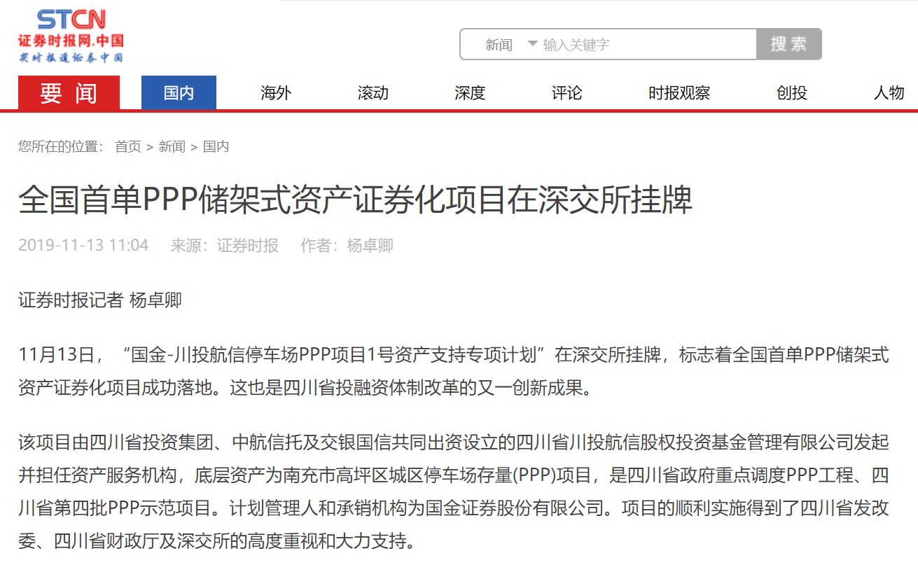 11月13日,“国金-710公海赌赌船官网欢迎您航信停车场PPP项目1号资产支持专项计划”在深交所挂牌,标志着全国首单PPP储架式资产证券化项目成功落地。这也是四川省投融资体制改革的又一创新成果。