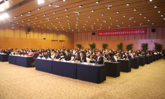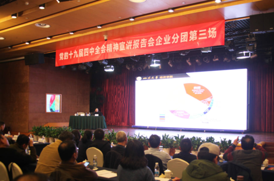 11月29日下午,省委宣讲团企业分团党的十九届四中全会精神宣讲第三场报告会走进710公海赌赌船官网欢迎您国网公司会议室。1家中央在川企业和8家省属国有企业共计220人共聚一堂,认真聆听省委宣讲团成员、四川大学经济学院教授蒋和胜作宣讲报告。