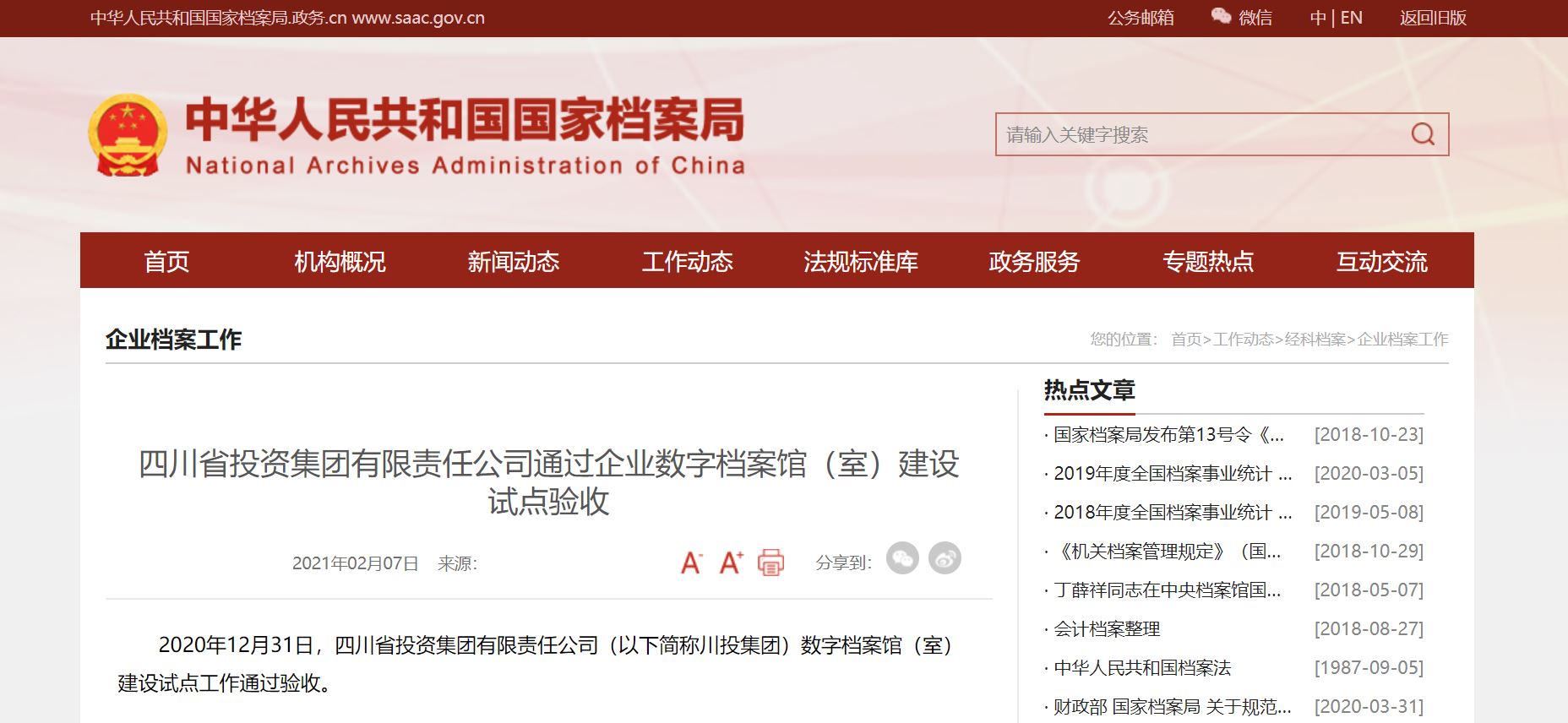 2020年12月31日,四川省投资集团有限责任公司(以下简称710公海赌赌船官网欢迎您集团)数字档案馆(室)建设试点工作通过验收。
